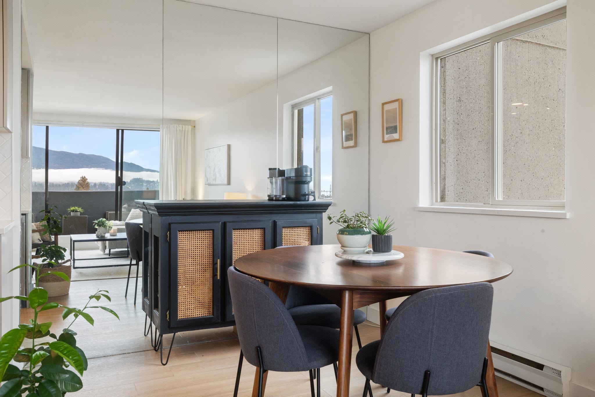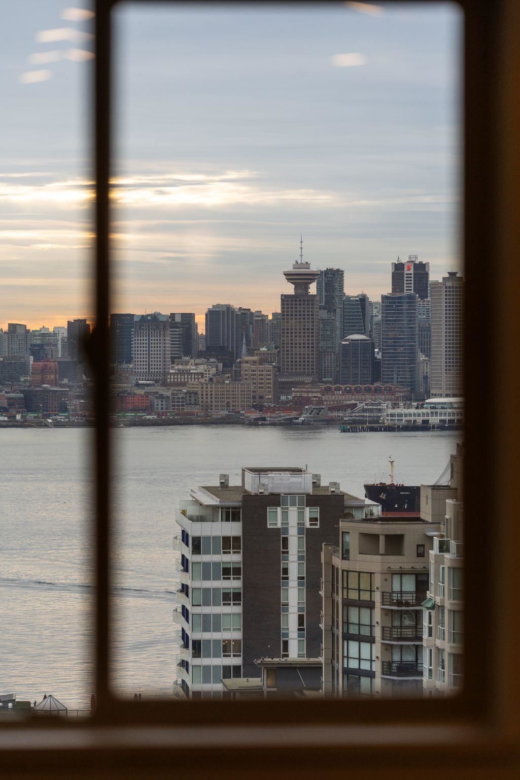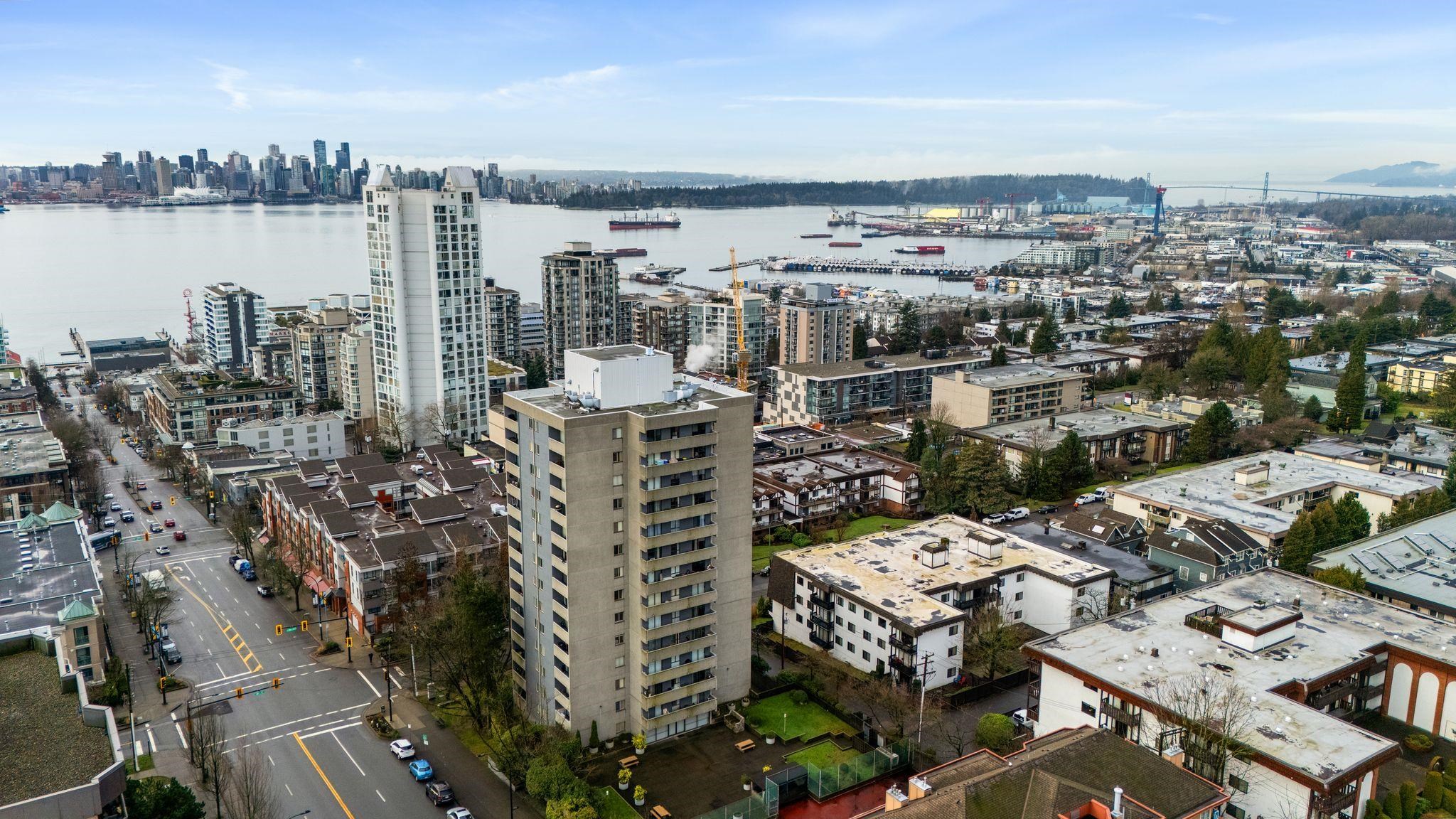 Spectacular southwest PANORAMIC VIEWS of the OCEAN, city skyline, Lions Gate Bridge & the Lions define this LUXURIOUSLY RENOVATED corner residence in a solid concrete building, in the heart of Lower Lonsdale. Thoughtfully updated, it features a new kitchen, custom cabinetry updated bathroom, luxury vinyl plank floors, new baseboards, smooth ceilings, quartz countertops, & new pot lighting. Bright, generously proportioned living & dining areas easily accommodate full-size furnishings, while principal rooms s...