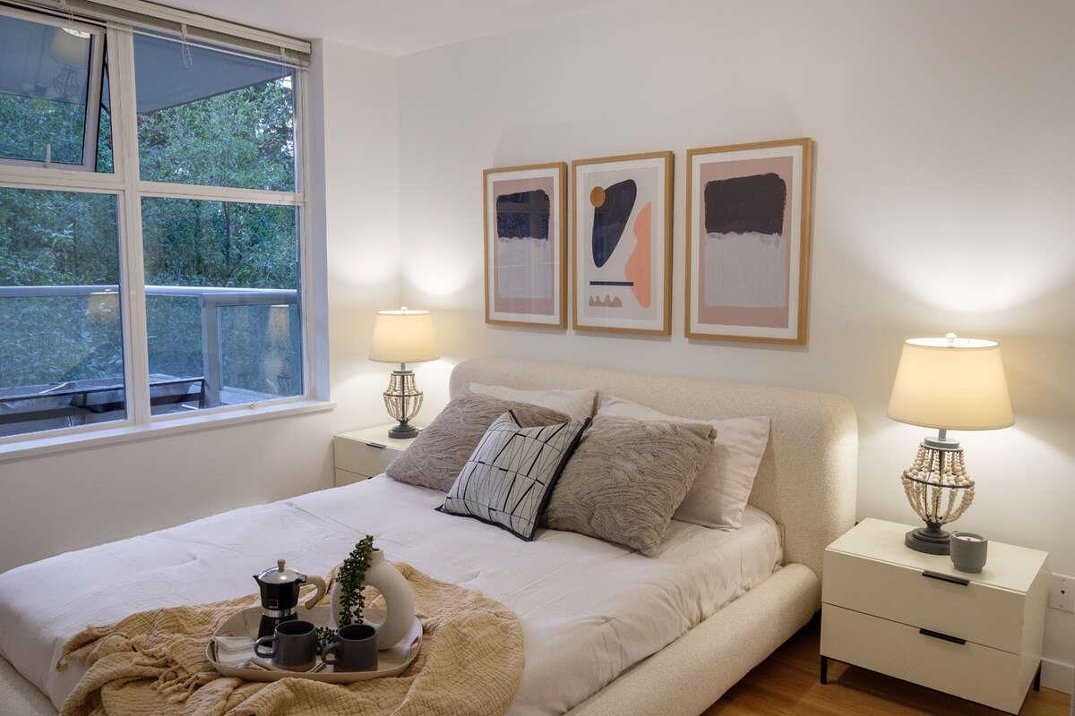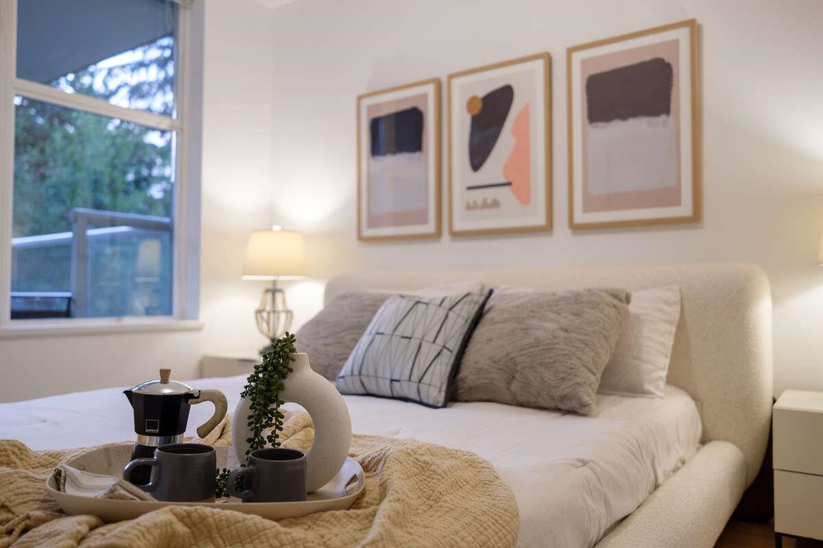 For more information, please click Brochure button. NOVO 2 North Tower, a well-managed concrete building. This move in ready, 811 sqft NW facing unit features an open-concept living area, in-suite laundry, and 1 parking stall next to the elevator. The 18' long balcony offers a perfect spot to unwind, where you can enjoy peekaboo views of the surrounding mountains. Freshly painted with smooth ceilings and upgraded hickory engineered wood flooring for a warm, “cottage-in-the-woods” ambiance. Close to hiking ...