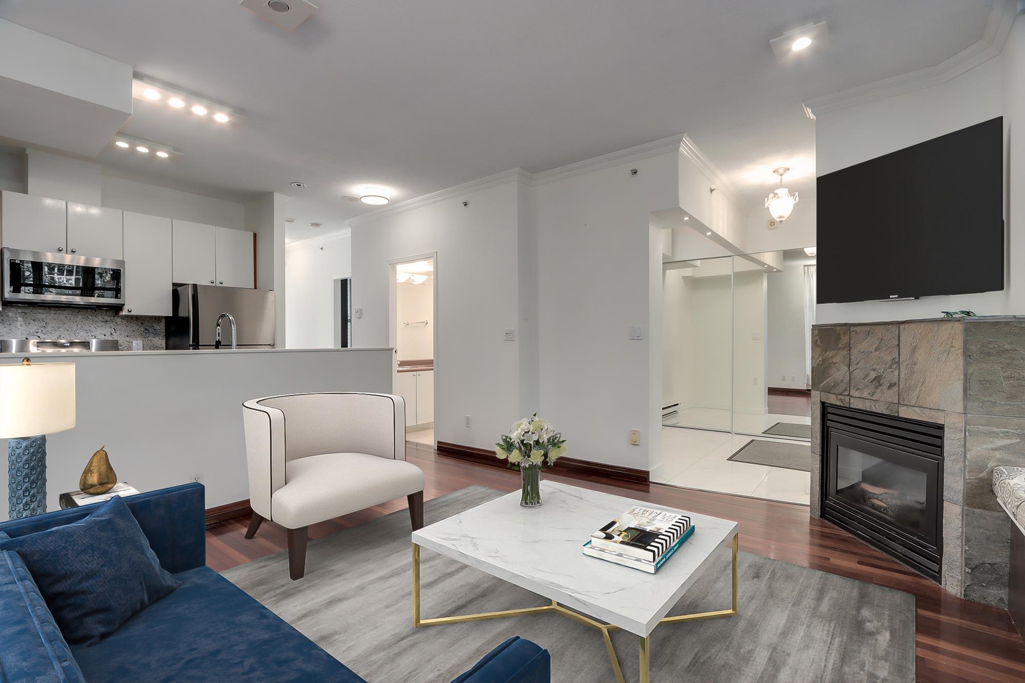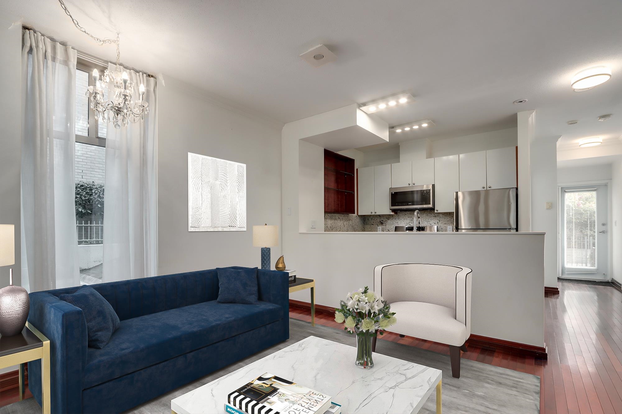 Walk up corner unit 2BD/2BA TOWNHOUSE in one of Yaletown's best buildings: The Savoy. Open floor plan, natural light, many upgrades incl heated marble flooring, new stove, granite counters, TWO patios, with almost 200 sqft outdoor space (front & back- rear faces building's private gardens), parking & storage. Move-in ready, showings by appt. Well equipped building: indoor pool, hot tub, sauna & large gym and party room. Beautiful lobbies @ both front & back entrances of building. Professionally measured @ 8...