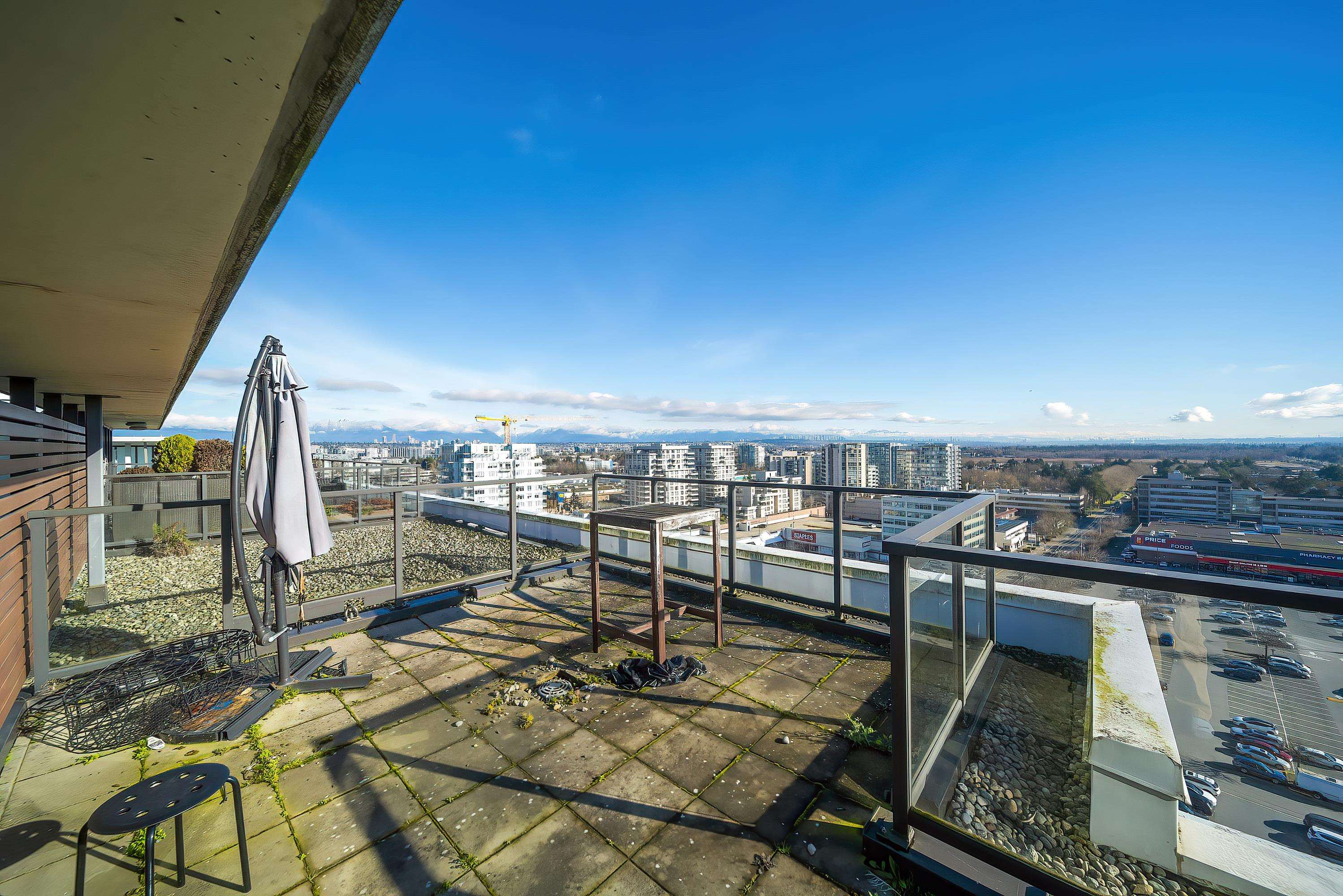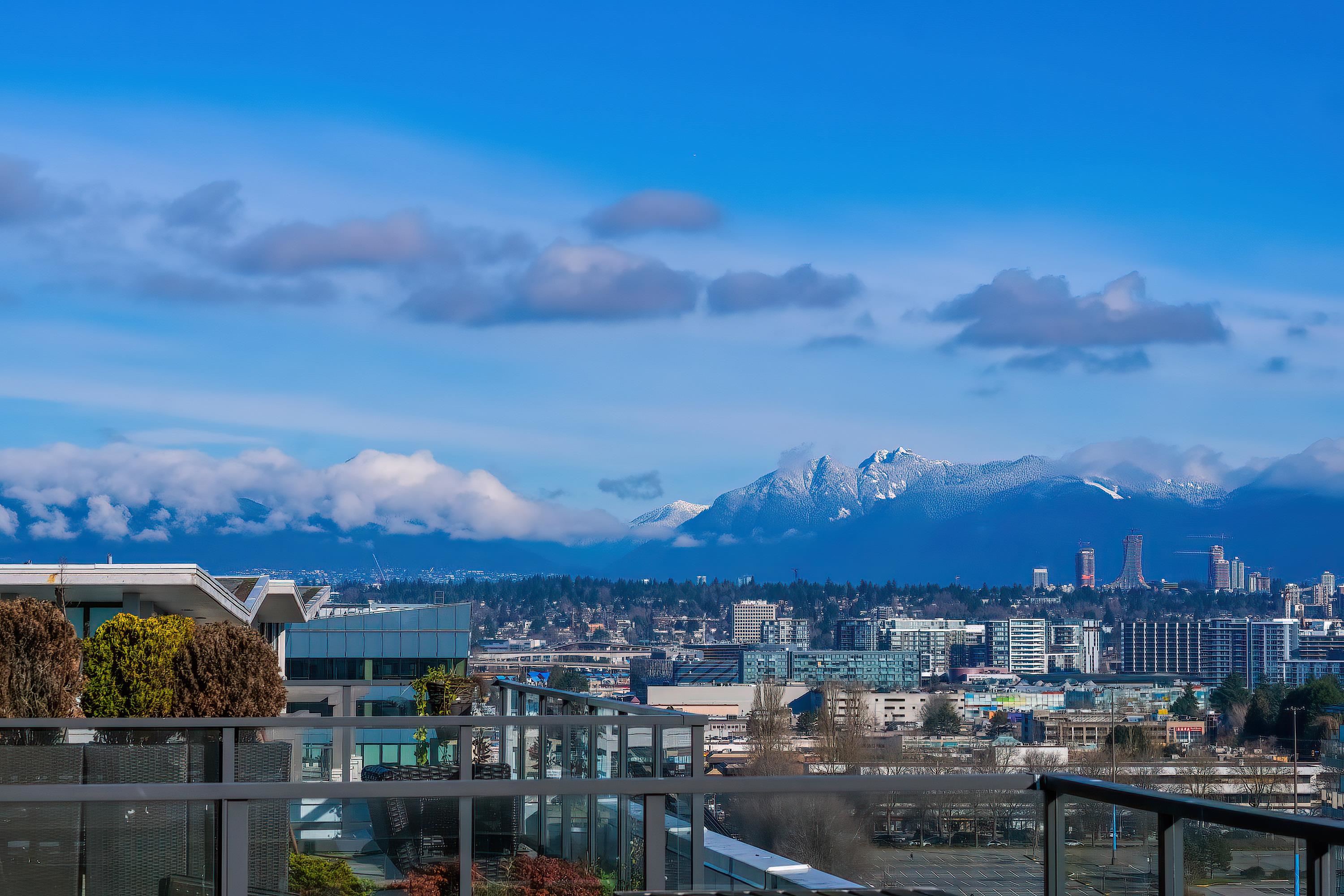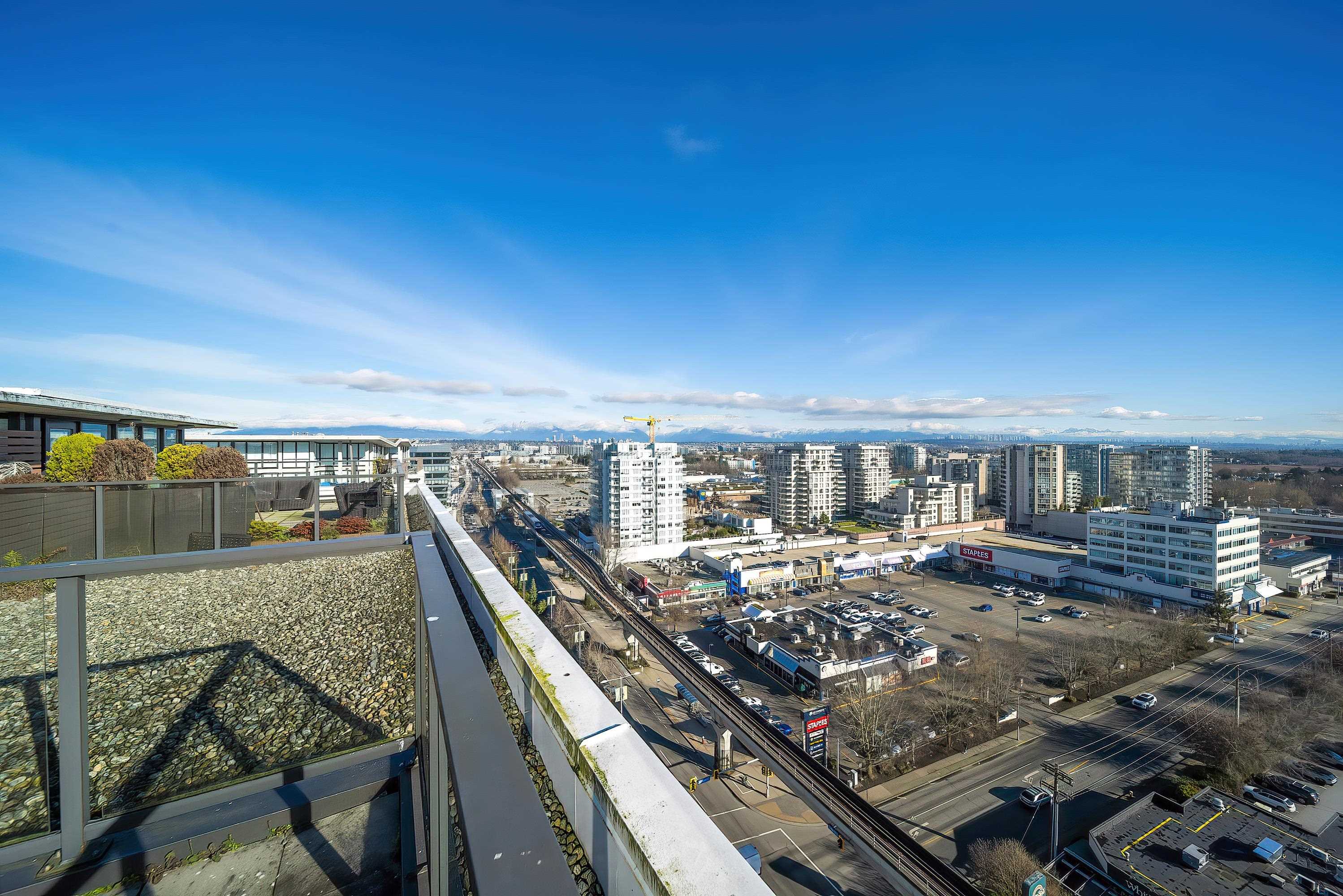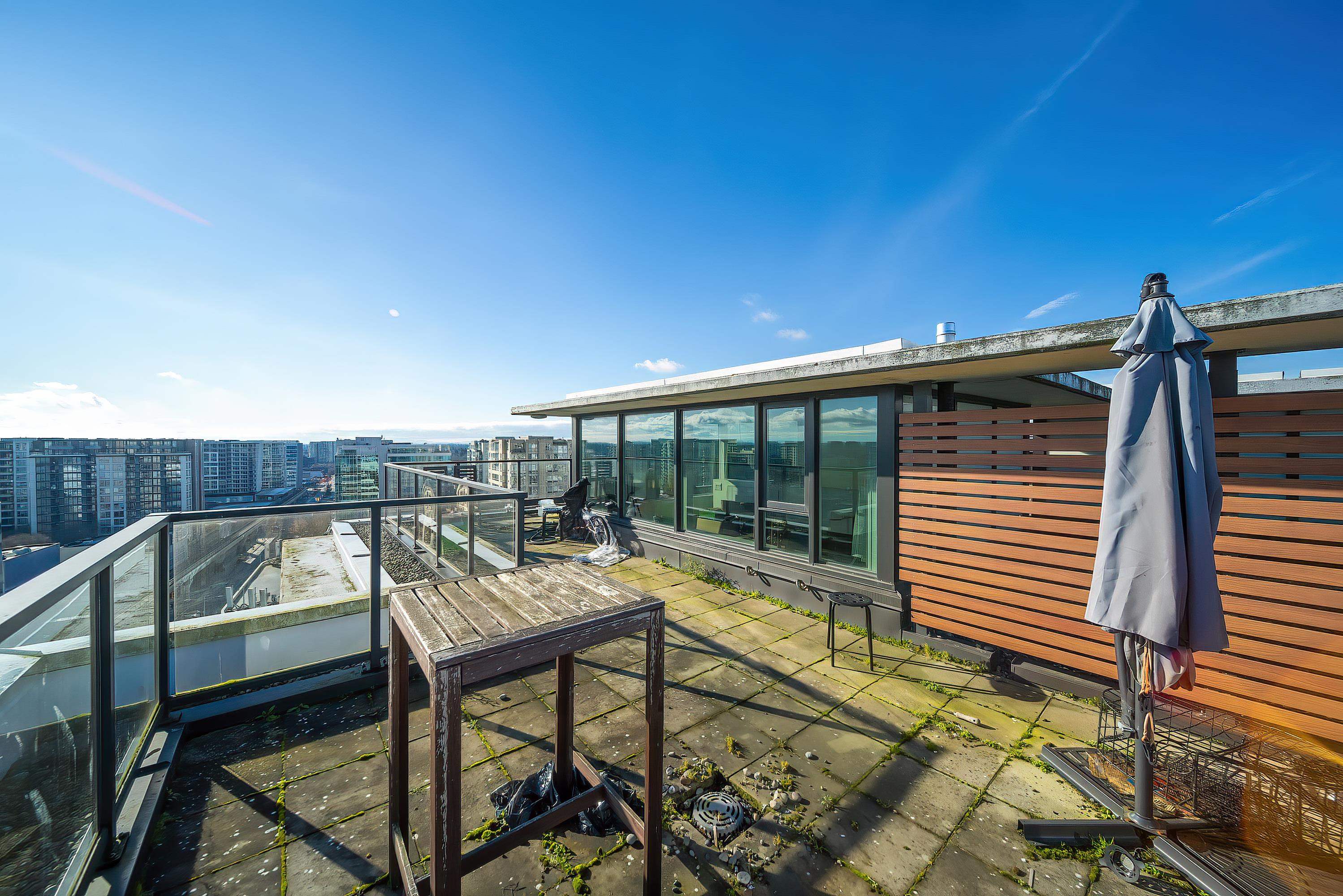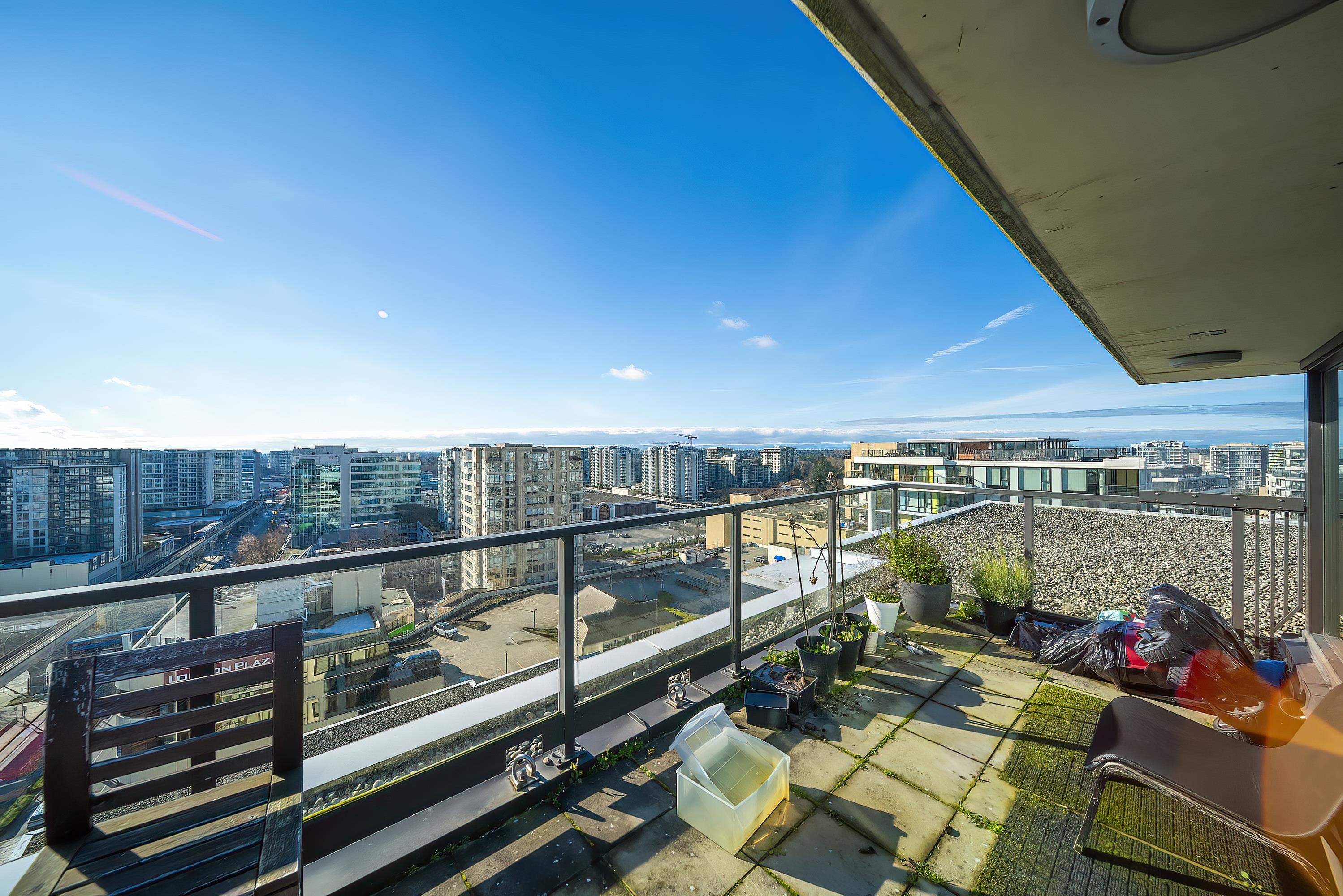 PENTHOUSE LIVING in the heart of Richmond! Amazing two bedrooms plus den. Two-level South-East Corner Unit Penthouse at Quintet Tower A! Two and a half bathroom. Main level balcony and upper-level huge patio total 530sqft. 270-degree views with mountain and city. Fantastic and reasonable floor plan with well-managed complex. High-end extra-large kitchen with steel appliances and plenty of cupboard space, BOSCH stainless appliances, gas cooktop, quartz counters, AIR CONDITIONING. Amenities include 75' indoor...